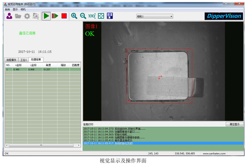 双X轴分立Y轴产品位置校正视觉定位应用XY轴运动视觉定位系统应用,玻璃面板点胶上料视觉位置校正点胶涂胶定位,点胶机吸料机械手视觉定位位置校正 双X轴分立Y轴产品位置校正视觉定位应用 一、案例介绍 iWatch 玻璃面板在点胶上料过程中需要进行视觉位置校正,为了满足点胶工艺流程要求和转运的高效性。机构上设计成双X轴,分立Y轴——其中一个X轴为接运料轴,第二个X轴加一个旋转轴为送料轴(又称吸料机械手),送料给多个工位进行点胶。多个独立Y轴将料接回到点胶工位进行涂胶作业。 这种非标准的运动控制平台,导致需要虚拟Y轴的标定方法。并且在计算产品位置偏差量时先给出X和θ的补偿量,保证在偏差很大是情况下,机械手也可以正常抓取物料;然后再给出Y方向的补偿量,独立的Y轴再进行补正操作接料,送入涂胶作业位置。 以正常抓取物料;然后再给出Y方向的补偿量,独立的Y轴再进行补正操作接料。